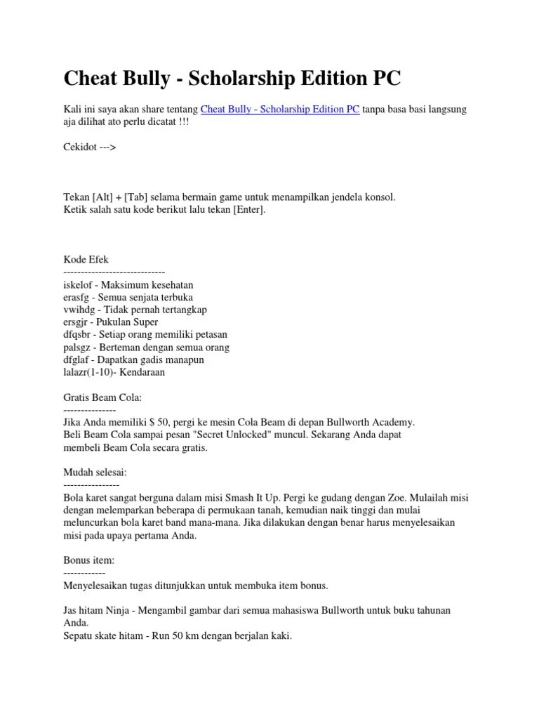 Scholarship edition cheats and cheat codes, pc free hh6h,get,.'for.,'mac. Scholarship edition.this trainer may not necessarily work with your copy of the game. Post by johnkittz » mon jun 12, 2017 3:11 pm. Four of these items grant special effects when worn; To use it, start cheat engine while bully is running, click the red/green blinking button to select a process, select bully.exe from the list, then on the tool bar, click table>show cheat table lua script.